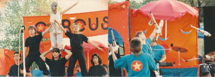 Joel's early career included working as a music director and a performer with Milwaukee's Cream City Semi-Circus from 1984-1991. The Cream City Semi-Circus was a show in the same tradition as groups like Make-A-Circus, the San Francisco Mime Troupe, Circus Amok, and other circus-theater groups that tackle social issues with a Vaudeville and Comedia d'elle Arte presentation. It was the free-in-the-park summer production of Milwaukee's own Friends Mime Theatre (FMT--now known as Milwaukee Public Theatre). Topics changed year to year, but there was always JUGGLING! Founded by Mike Moynihan and Barbara Leigh, we worked with such artists as Ron Anderson (Springer Theater Academy founder, Columbus, GA) and Jennifer Miller (Circus Amok founder, NYC) pictured below (pictured left to right Ron Anderson, Joel Davel, Paula Sjogerman [masked], __ [below], Debbie Davis, Jennifer Miller.) It was a formative experience.